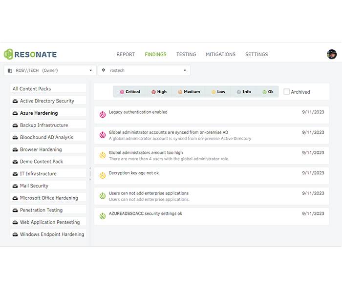 Sicherheit kommt auch dadurch zustande, dass man mit Systemen arbeitet, die regelmäßig aufgeräumt und aktuell gehalten werden. Durch die wiederkehrende strukturierte Abarbeitung von Prüfkatalogen wird eine bereits gehärtete Umgebung erneut unter die Lupe genommen, um für langfristige Sicherheit zu sorgen. RESONATE bietet hierzu den nötigen Überblick – wo war man vor einem Jahr, und wo steht man jetzt?
